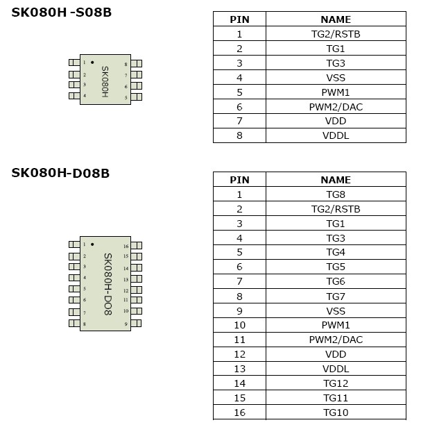 ![]() SK080H-DIP8/SOP8/SOP16語音IC管腳及定義圖