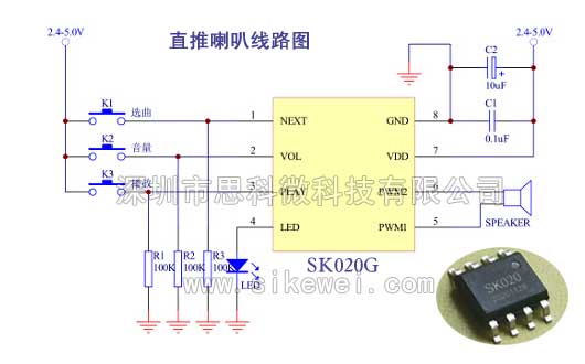 叮咚門(mén)鈴芯片直推喇叭電路圖,門(mén)鈴音樂(lè)芯片直推喇叭接線圖,內(nèi)置0.5W喇叭直推線路(Direct-Drive),不需要外加零件,音質(zhì)與音量比傳統(tǒng)"Cout+三極管"更佳,且耗電量更少