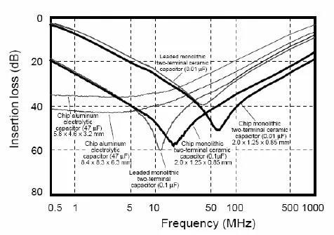 Z=ESR+jωL-1/jωC= ESR+j2πf L-1/j2πf C�?梢姰旑l率很低的時候是電容起作用,而頻率高到一定的時候電感的作用就不可忽視了,再高的時候電感就起主導作用了。電容就失去濾波的作用了。所以記住,高頻的時候電容就不是單純的電容了。實際電容的濾波曲線如下圖所示。